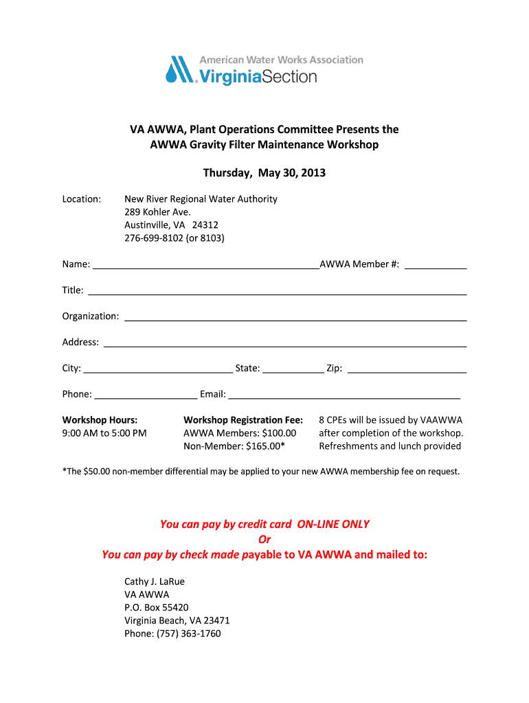 VA AWA, Plant Operations Committee Presents the AWA Gravity Filter Maintenance Workshop Thursday, May 30, 2013, Location: New River Regional Water Authority 289 Kohler Ave. Fultonville, VA 24312 2766998102