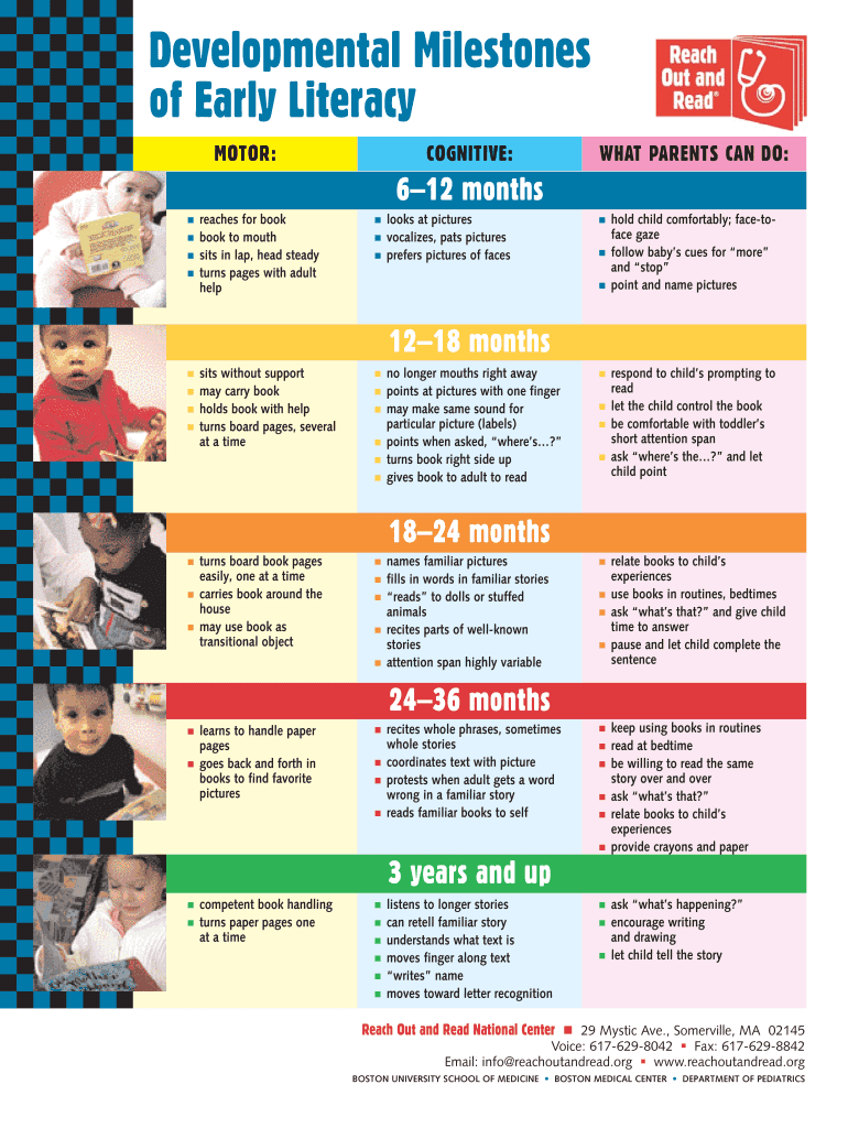 Developmental Milestones of Early Literacy MOTOR:COGNITIVE:WHAT PARENTS CAN DO:612 months reaches for book to mouth sits in lap, head steady turns pages with adult help looks at pictures vocalizes,