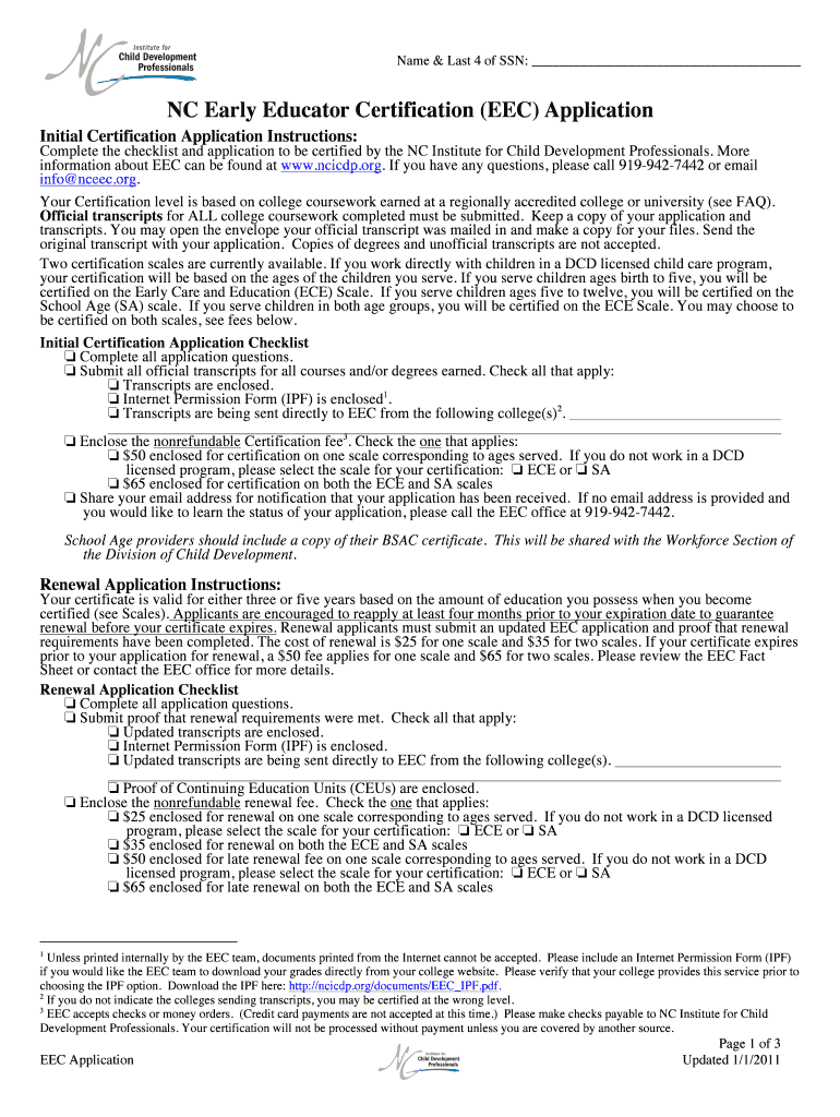 Name & Last 4 of SSN: NC Early Educator Certification (EEC) Application Initial Certification Application Instructions: Complete the checklist and application to be certified by the NC Institute for