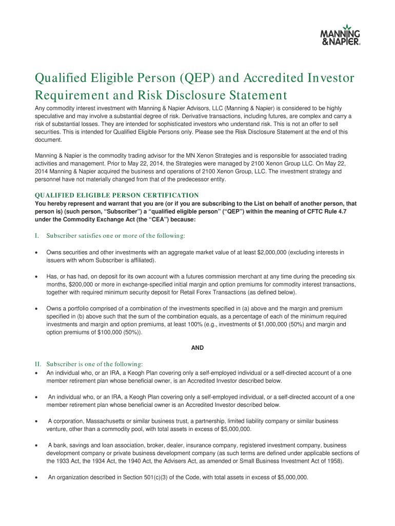 Qualified Eligible Person (REP) and Accredited Investor Requirement and Risk Disclosure Statement Any commodity interest investment with Manning & Napier Advisors, LLC (Manning & Napier) is considered