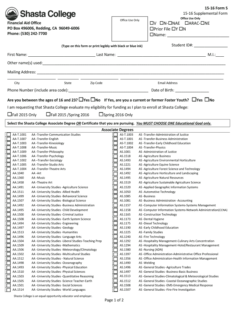 1516 Form S 1516 Supplemental Form Office Use Only Financial Aid Office PO Box 496006, Redding, CA 960496006 Phone: (530) 2427700 (Type on this form or print legibly with black or blue ink) Office
