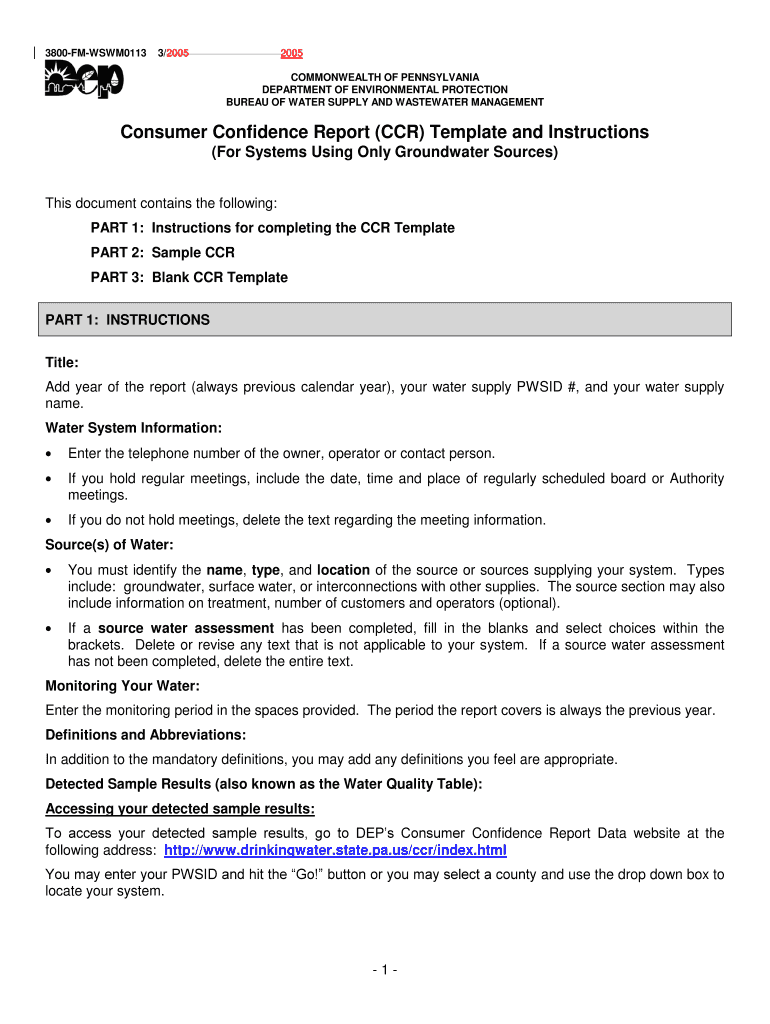 3800FMWSWM0113 3/2005 2005 COMMONWEALTH OF PENNSYLVANIA DEPARTMENT OF ENVIRONMENTAL PROTECTION BUREAU OF WATER SUPPLY AND WASTEWATER MANAGEMENT Consumer Confidence Report (CCR) Template and Instructions