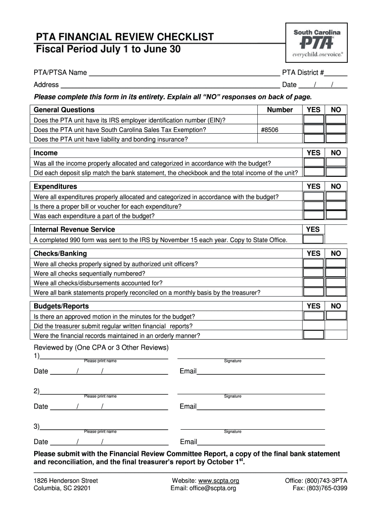 Get the free PTA FINANCIAL REVIEW CHECKLIST Fiscal Period July 1 to June 30 - scpta