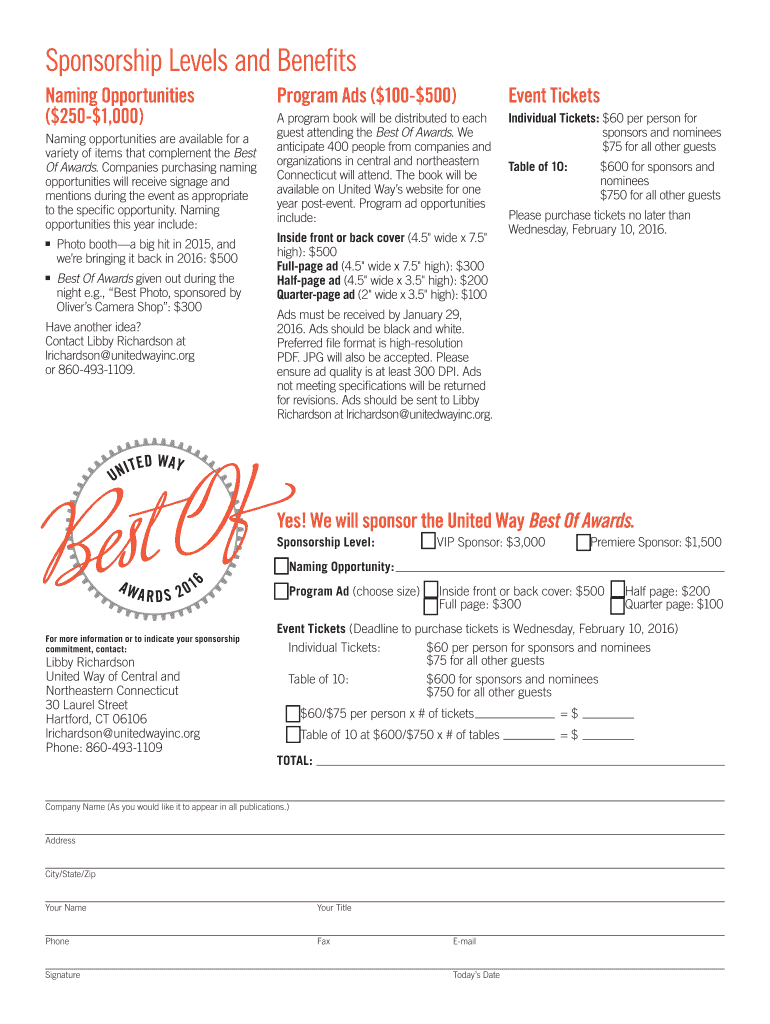 Sponsorship Opportunities Please join us in sponsoring the Best Of Awards, then join us for a night of fun February 19, 2016, Hartford Marriott Downtown The United Way Best Of Awards highlight workplaces