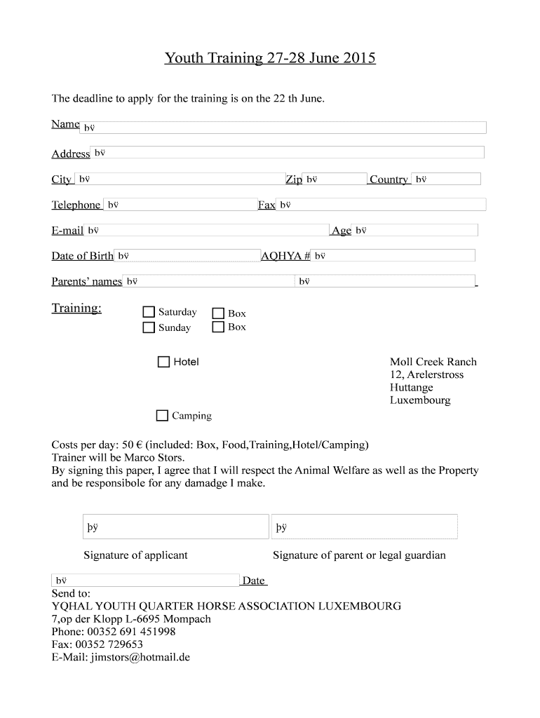 Youth Training 2728 June 2015 The deadline to apply for the training is on the 22nd June. Name Address City Zip Telephone Country Fax Email Age Date of Birth AQUA # Parents names Training: Saturday