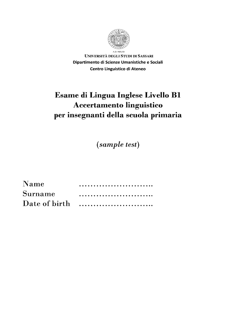 UNIVERSITY DELI STUDIO DI SASS ARI Divertimento di Science Humanistic e Social CENTR Linguistic DI Stereo Same DI Lingual Singles Lively B1 Accertamento linguistic per indignant Della Sculley prim
