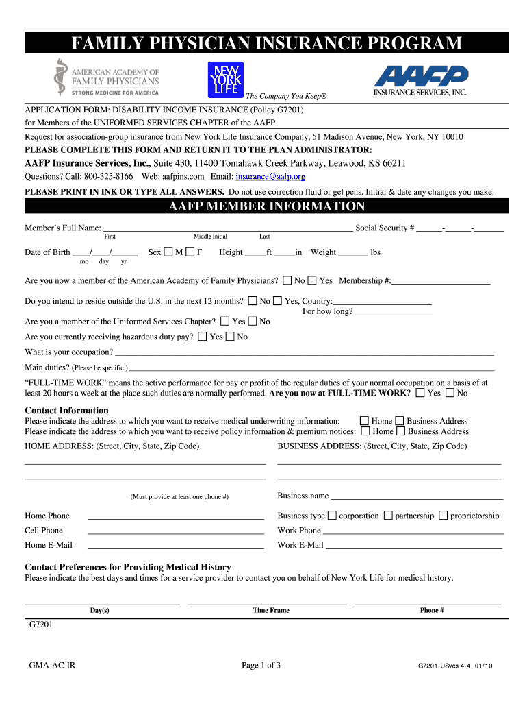 Eligibility for this form typically includes members of the American Academy of Family Physicians (AAFP). Applicants should be seeking disability income insurance coverage through New York Life Insurance Company.