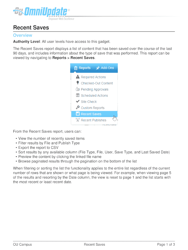 Recent Saves Overview Authority Level: All user levels have access to this gadget. The Recent Saves report displays a list of content that has been saved over the course of the last 90 days, and includes