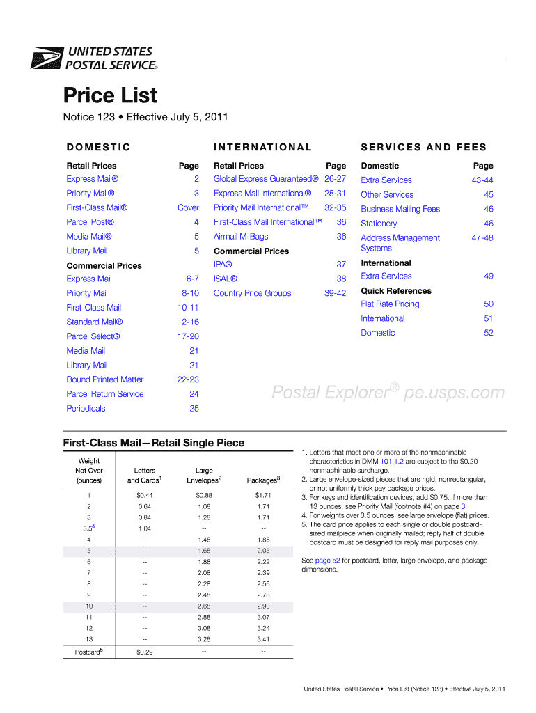 Price List Notice 123 Effective July 5, 2011, DOMESTIC I N T E R N AT I O N A L Retail Prices Page Express Mail 2 Priority Mail Domestic Page Global Express Guaranteed 2627 Extra Services 4344 3 Express