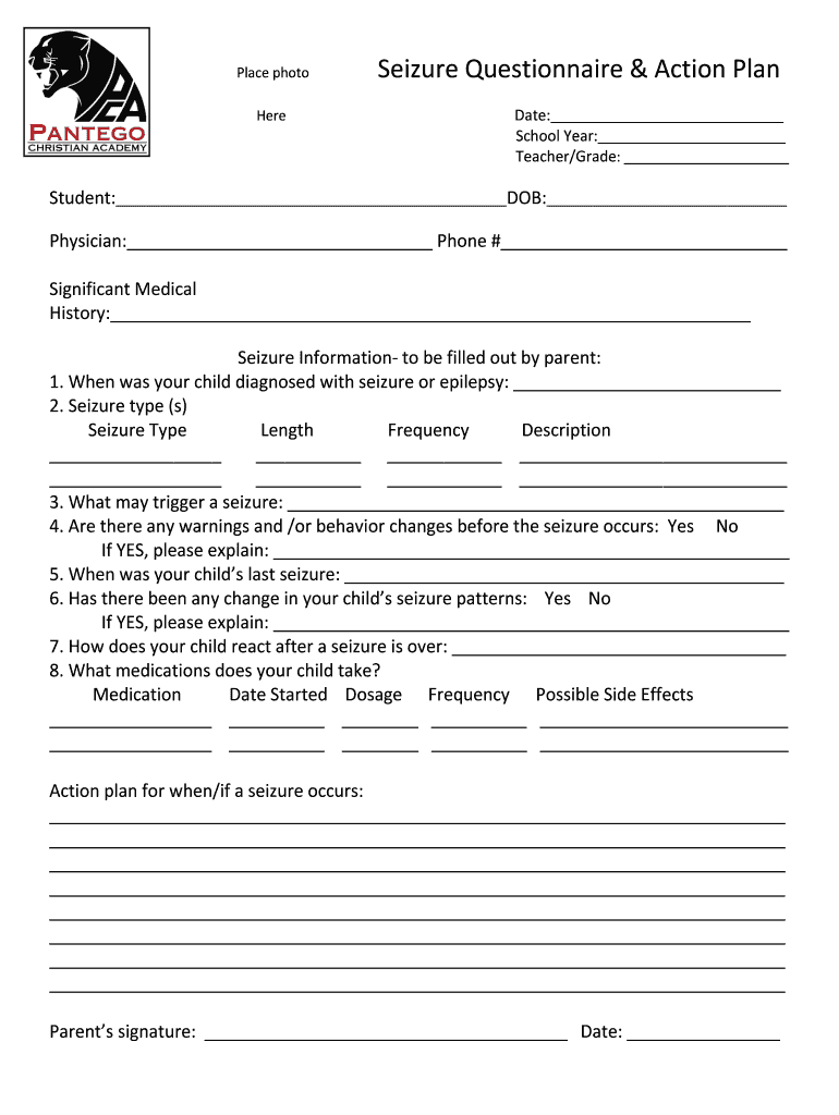 Place photo Here Seizure Questionnaire & Action Plan Date: School Year: Teacher/Grade: Student: DOB: Physician: Phone # Significant Medical History: Seizure Information to be filled out by parent: