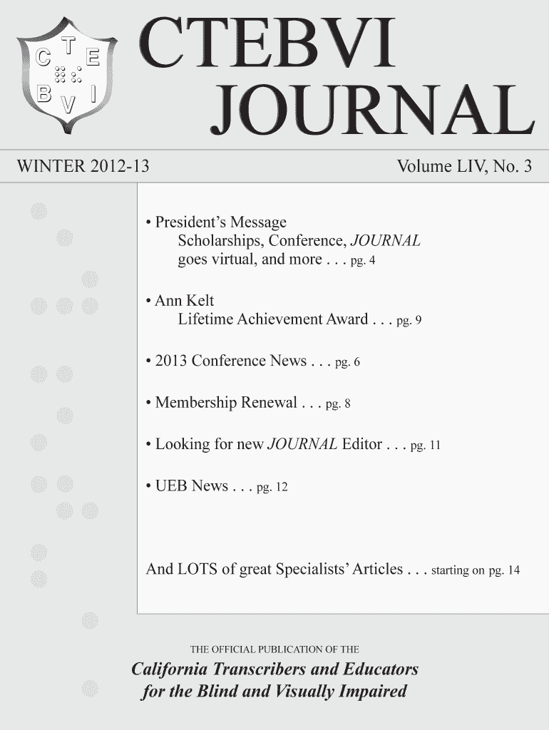 CTE BVI JOURNAL WINTER 201213 Volume LIV, No. 3 Presidents Message Scholarships, Conference, JOURNAL goes virtual, and more. . . Pg. 4 Ann KELT Lifetime Achievement Award. . . Pg. 9 2013 Conference