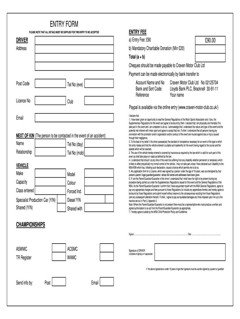 ENTRY FORM PLEASE NOTE THAT ALL DETAILS MUST BE SUPPLIED FOR THIS ENTRY TO BE ACCEPTED ENTRY FEE DRIVER a) Entry Fee: 90 Address b) Mandatory Charitable Donation (Min 20) 90.00 Total (a + b) Checks