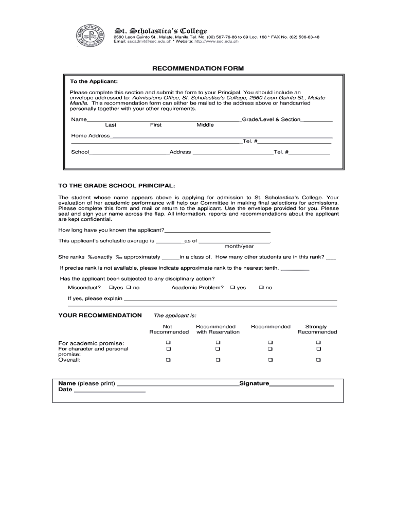 St. Scholastic as College 2560 Leon Into St., Palate, Manila Tel. No. (02) 5677686 to 89 LOC. 168 * FAX No. (02) 5366348 Email: admit SSC.edu.pH * Website: http://www.ssc.edu.ph RECOMMENDATION FORM