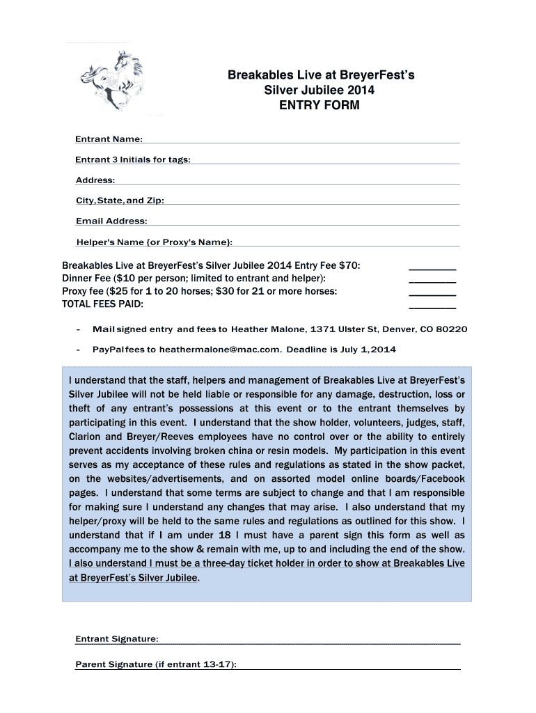 Get the free Breakables Live at BreyerFests Silver Jubilee 2014 ENTRY FORM
