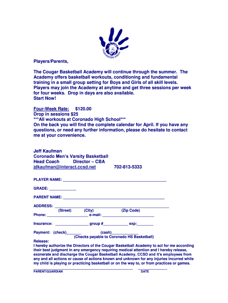Form cougar basketball academy is a registration form for individuals interested in joining the basketball academy.