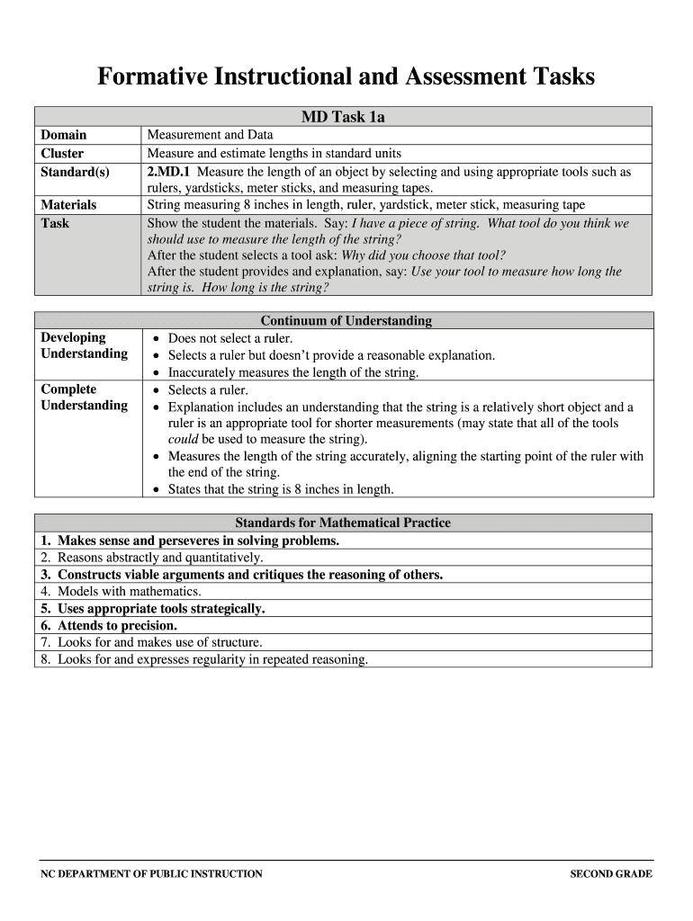 Formative Instructional and Assessment Tasks MD Task 1a Domain Cluster Standard(s) Materials Task Developing Understanding Complete Understanding Measurement and Data Measure and estimate lengths