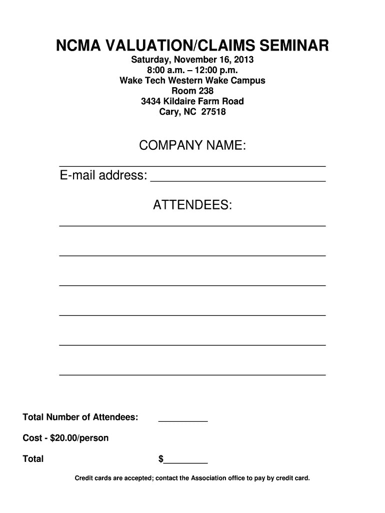 NCAA VALUATION/CLAIMS SEMINAR Saturday, November 16, 2013 8:00 a.m. 12:00 p.m. Wake Tech Western Wake Campus Room 238 3434 Kildare Farm Road Cary, NC 27518 COMPANY NAME: Email address: ATTENDEES: