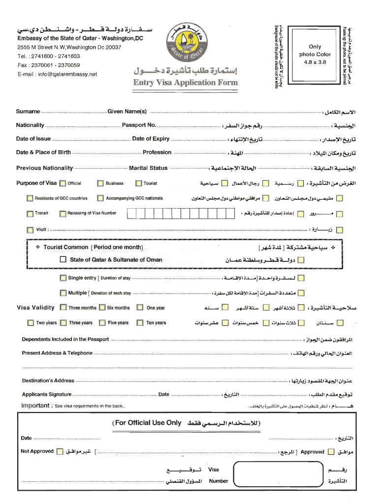 QATAR Visa Requirements: ! ! ! ! ! ! ! ! ! ! Signed Passport valid for six months with at least one blank visa page. One visa application form completed and signed. (clearly printed) Two color passport