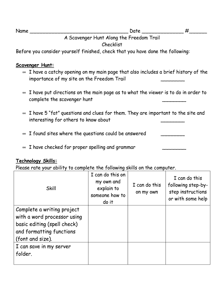 Name Date # A Scavenger Hunt Along the Freedom Trail Checklist Before you consider yourself finished, check that you have done the following: Scavenger Hunt: I have a catchy opening on my main page