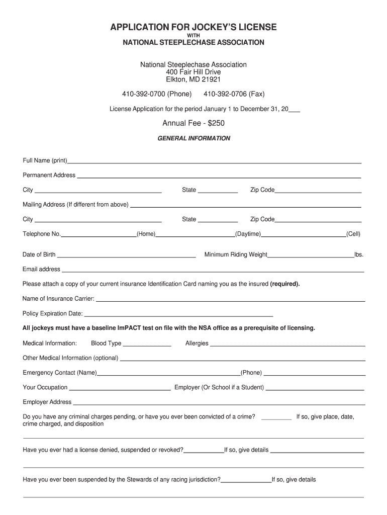 NSA Jockey Application is a form that jockeys are required to fill out in order to participate in NSA (National Steeplechase Association) races.