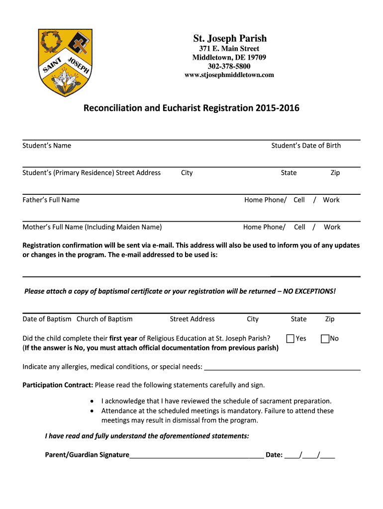 St. Joseph Parish 371 E. Main Street Middletown, DE 19709 3023785800 www.stjosephmiddletown.com Reconciliation and Eucharist Registration 20152016 Students Name Students Date of Birth Students (Primary