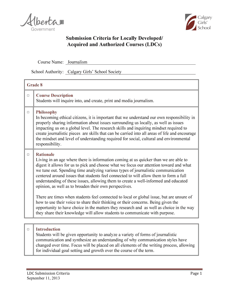 Submission Criteria for Locally Developed/ Acquired and Authorized Courses (LDCs) Course Name: Journalism School Authority: Calgary Girls School Society Grade 8 Course Description Students will inquire