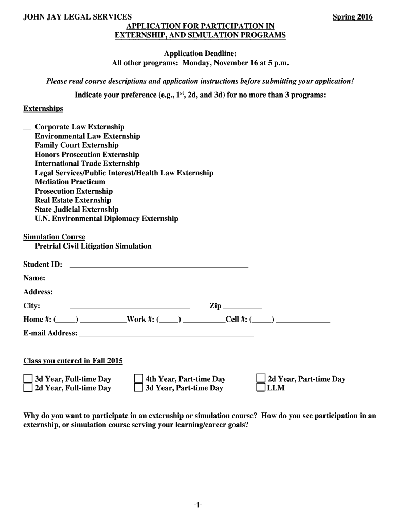 JOHN JAY LEGAL SERVICES APPLICATION FOR PARTICIPATION IN EXTERNSHIP, AND SIMULATION PROGRAMS Spring 2016 Application Deadline: All other programs: Monday, November 16 at 5 p.m. Please read course