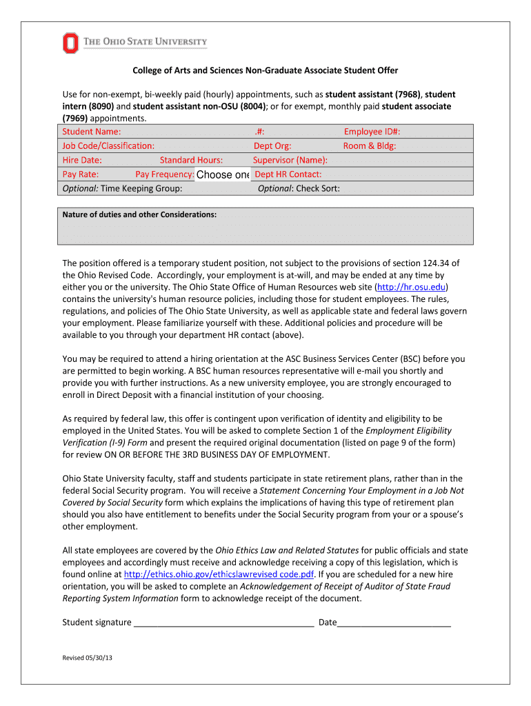 College of Arts and Sciences Graduate from Associate Student Offer Use for nonexempt, biweekly paid (hourly) appointments, such as student assistant (7968), student intern (8090) and student assistant