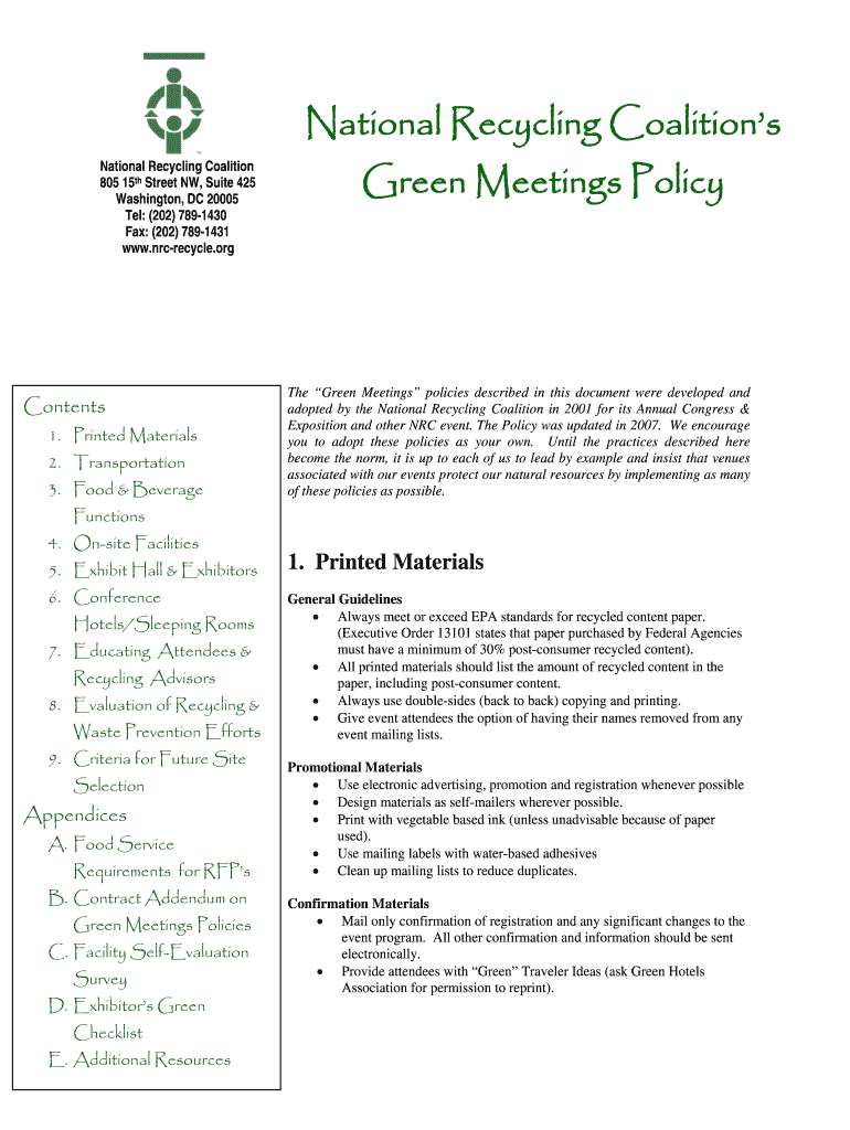 National Recycling Coalitions National Recycling Coalition 805 15th Street NW, Suite 425 Washington, DC 20005 Tel: (202) 7891430 Fax: (202) 7891431 www.nrcrecycle.org Contents 1. Printed Materials