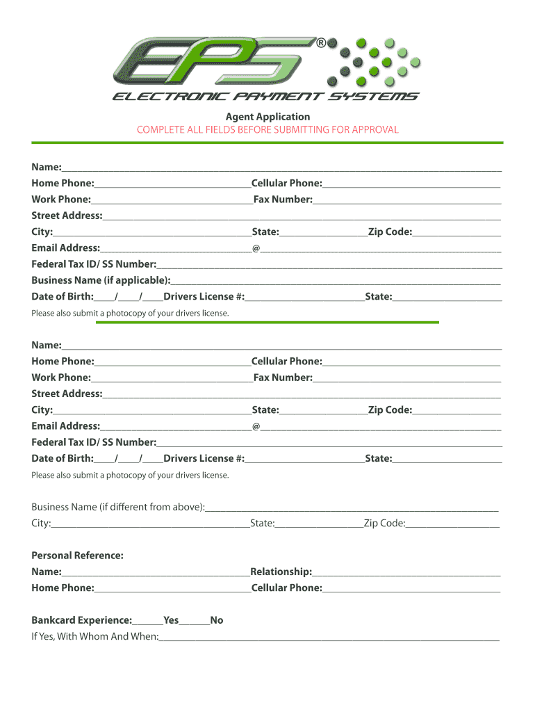Agent Application COMPLETE ALL FIELDS BEFORE SUBMITTING FOR APPROVAL Name: Home Phone: Cellular Phone: Work Phone: Fax Number: Street Address: City: State: Zip Code: Email Address: Federal Tax ID/