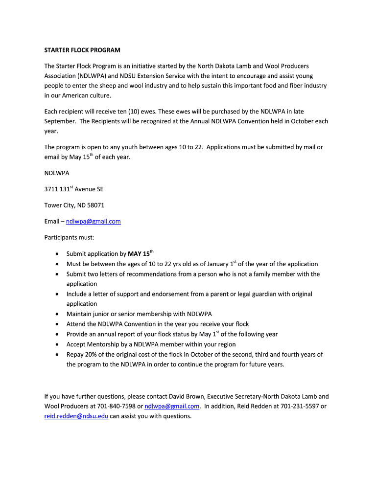 The Starter Flock Program is an initiative started by the North Dakota Lamb and Wool Producers