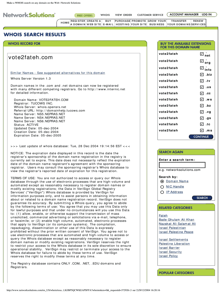 Make a WHOPS search on any domain on the Web Network Solutions HOME REGISTER CREATE A BUY PURCHASE PROMOTE GROW YOUR TRANSFER RENEW A DOMAIN Website EMAIL HOSTING YOUR SITE BUSINESS YOUR DOMAINS SERVICES