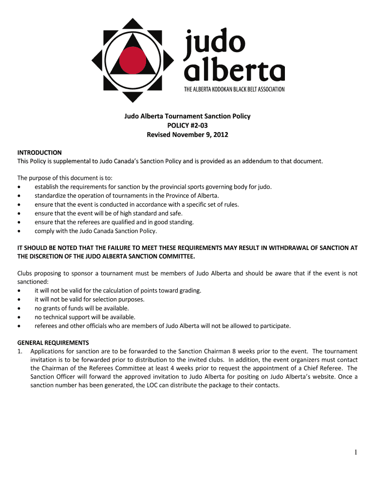 Judo Alberta Tournament Sanction Policy #203 Revised November 9, 2012, INTRODUCTION This Policy is supplemental to Judo Canada's Sanction Policy and is provided as an addendum to that document. The