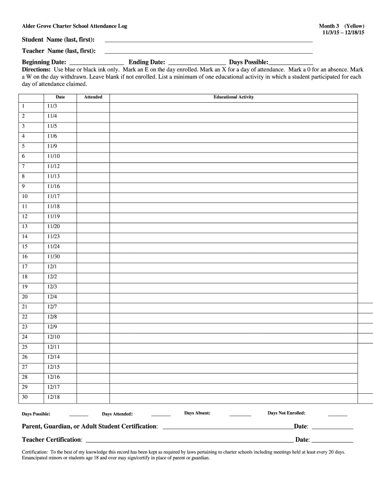 Alder Grove Charter School Attendance Log Month 3 (Yellow) 11/3/15 12/18/15 Student Name (last, first): Teacher Name (last, first): Beginning Date: Ending Date: Days Possible: Directions: Use blue