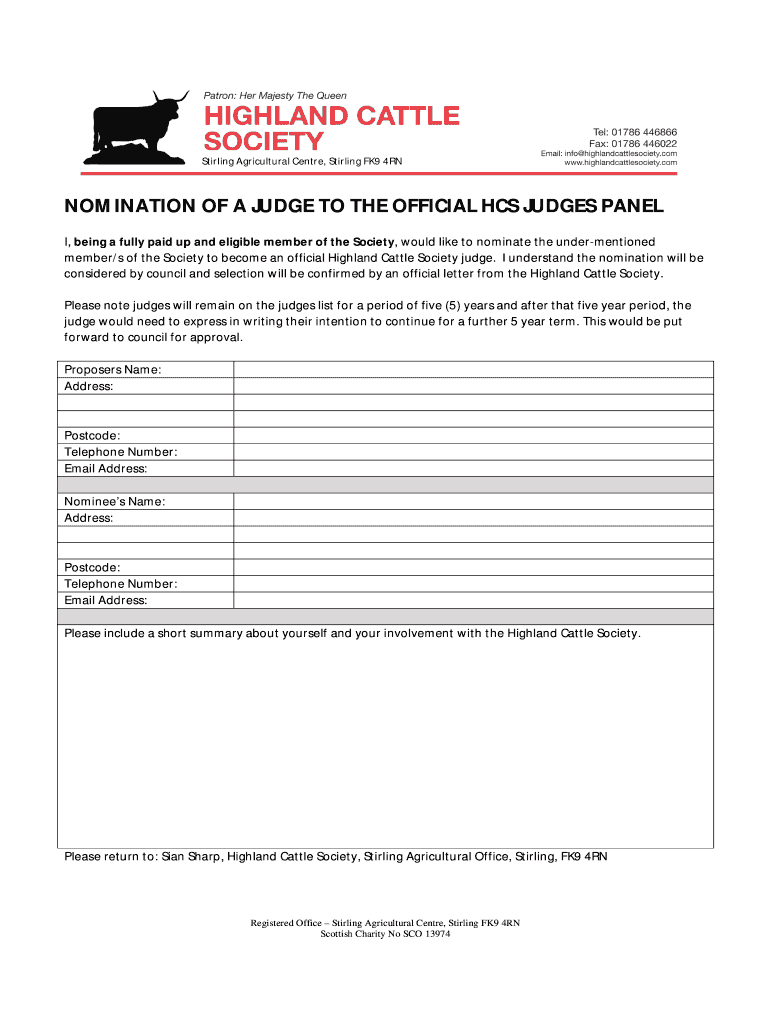 Stirling Agricultural Center, Stirling FK9 4RN NOMINATION OF A JUDGE TO THE OFFICIAL HCS JUDGES PANEL I, being a fully paid up and eligible member of the Society, would like to nominate the undermentioned