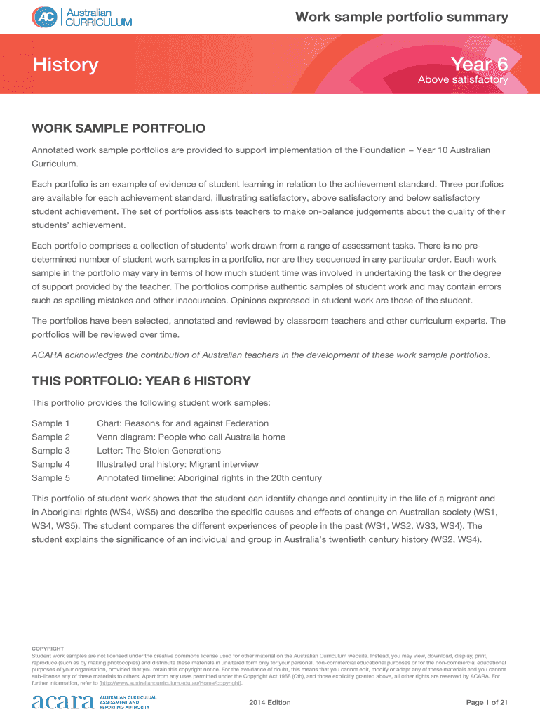 This document provides a summary of work samples from Year 6 students in History, illustrating their achievements aligned with the Australian Curriculum standards. It includes students' work samples