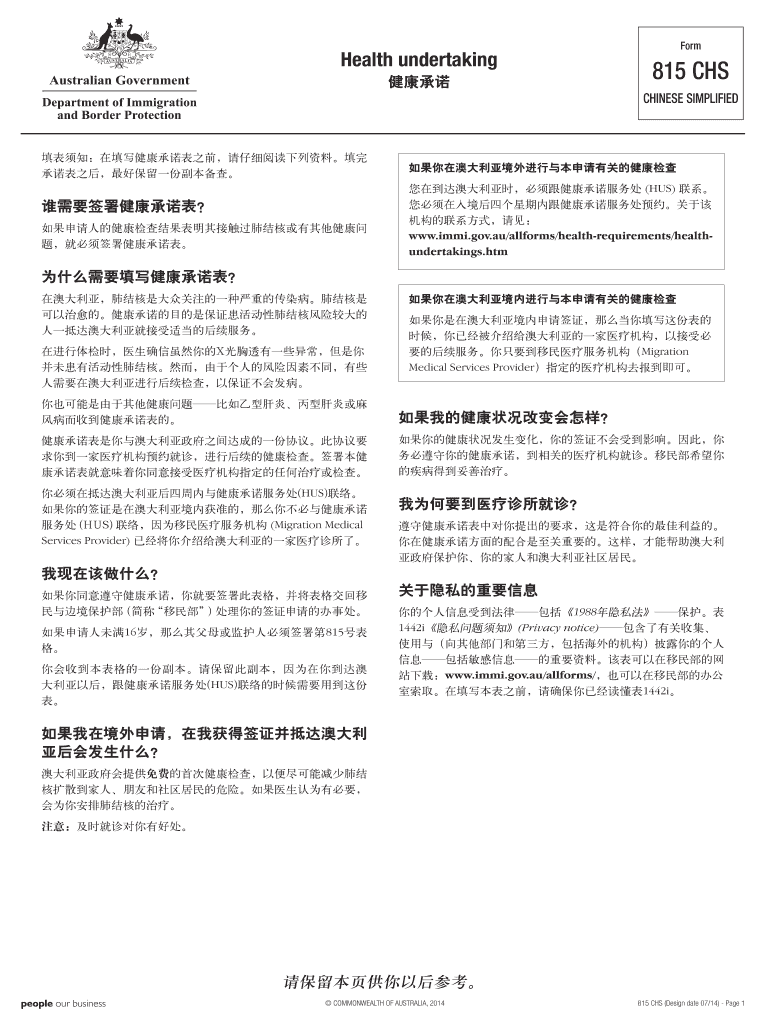 The Health Undertaking Form 815 is a vital document required in Australia for immigrants who may present health risks, such as tuberculosis. This form outlines the commitment to undergo health checks and follow-ups upon entering the country. It is crucial for ensuring adherence to Australian health standards, promoting public health safety. Both the applicant and, if necessary, a parent or guardian must sign the form to validate the commitment to these health undertakings.