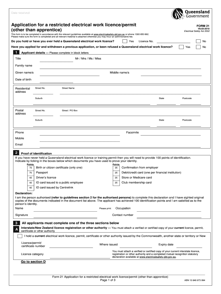 Date received Application for a restricted electrical work license/permit (other than apprentice) FORM 21 V8.032010 Electrical Safety Act 2002 This form is to be completed in accordance with the relevant