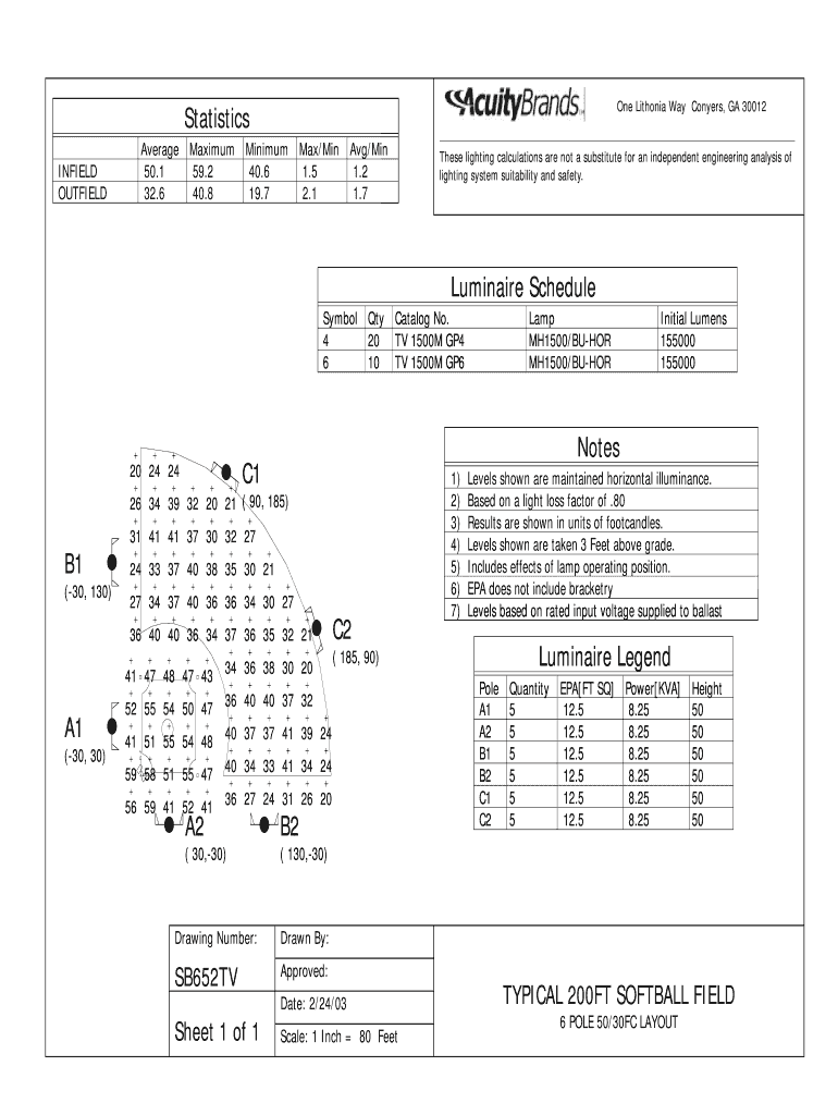 One Lithuania Way Confers, GA 30012 Statistics INFIELD OUTFIELD Average Maximum 50.1 59.2 32.6 40.8 Minimum Max/Min 40.6 1.5 19.7 2.1 Avg/Min 1.2 1.7 These lighting calculations are not a substitute