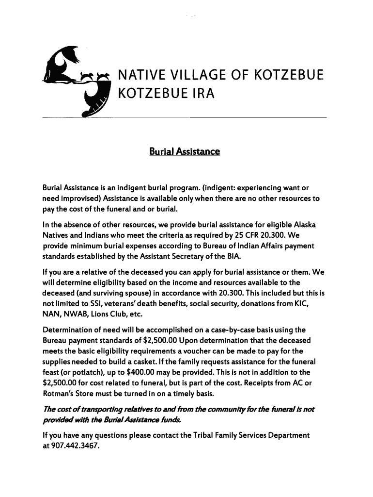 NATIVE VILLAGE OF KOTZEBUE IRA Burial Assistance is an indigent burial program. (indigent: experiencing want or need improvised) Assistance is available only when there are no other resources to pay