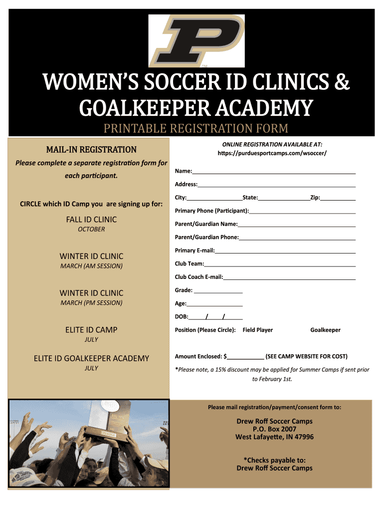WOMEN SOCCER ID CLINICS & GOALKEEPER ACADEMY PRINTABLE REGISTRATION FORM ONLINE REGISTRATION AVAILABLE AT: https://purduesportcamps.com/wsoccer/ MAILING REGISTRATION Please complete a separate registration