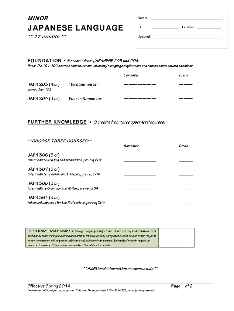 MINOR Name: JAPANESE LANGUAGE ID: ** 17 credits ** ; Certified: Updated: FOUNDATION 8 credits from JAPANESE 203 and 204: Note: The 101102 courses constitute our universities language requirement and