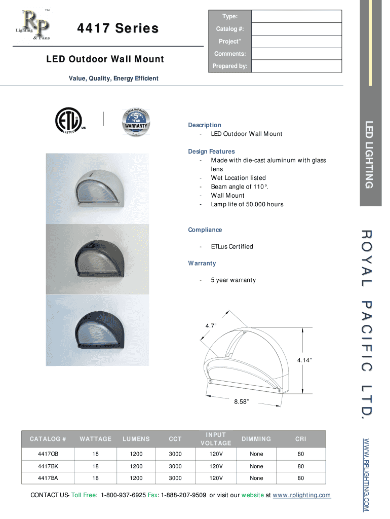 Type: 4417 Series Catalog #: Project Comments: LED Outdoor Wall Mount Prepared by: Value, Quality, Energy Efficient Design Features Made with die-cast aluminum with glass lens Wet Location listed