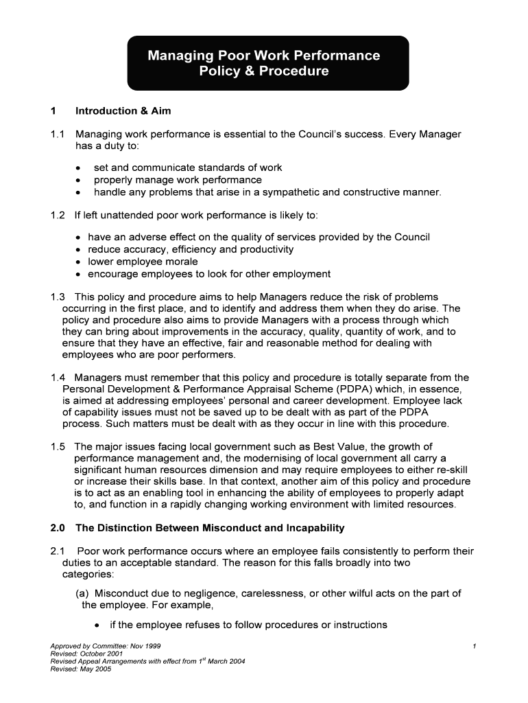 Managing Poor Work Performance Policy & Procedure 1Introduction & Aim1.1 Managing work performance is essential to the Councils success. Every Manager has a duty to: set and communicate standards