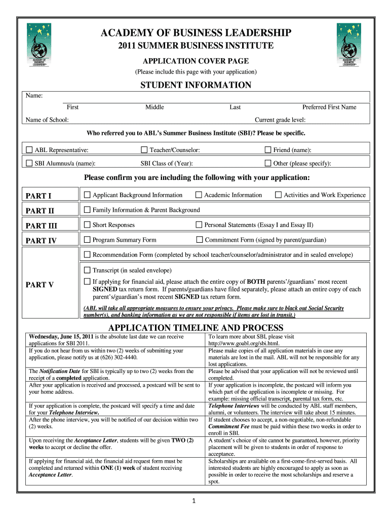 ACADEMY OF BUSINESS LEADERSHIP 2011 SUMMER BUSINESS INSTITUTE APPLICATION COVER PAGE (Please include this page with your application) STUDENT INFORMATION Name: First Middle Last Name of School: Preferred