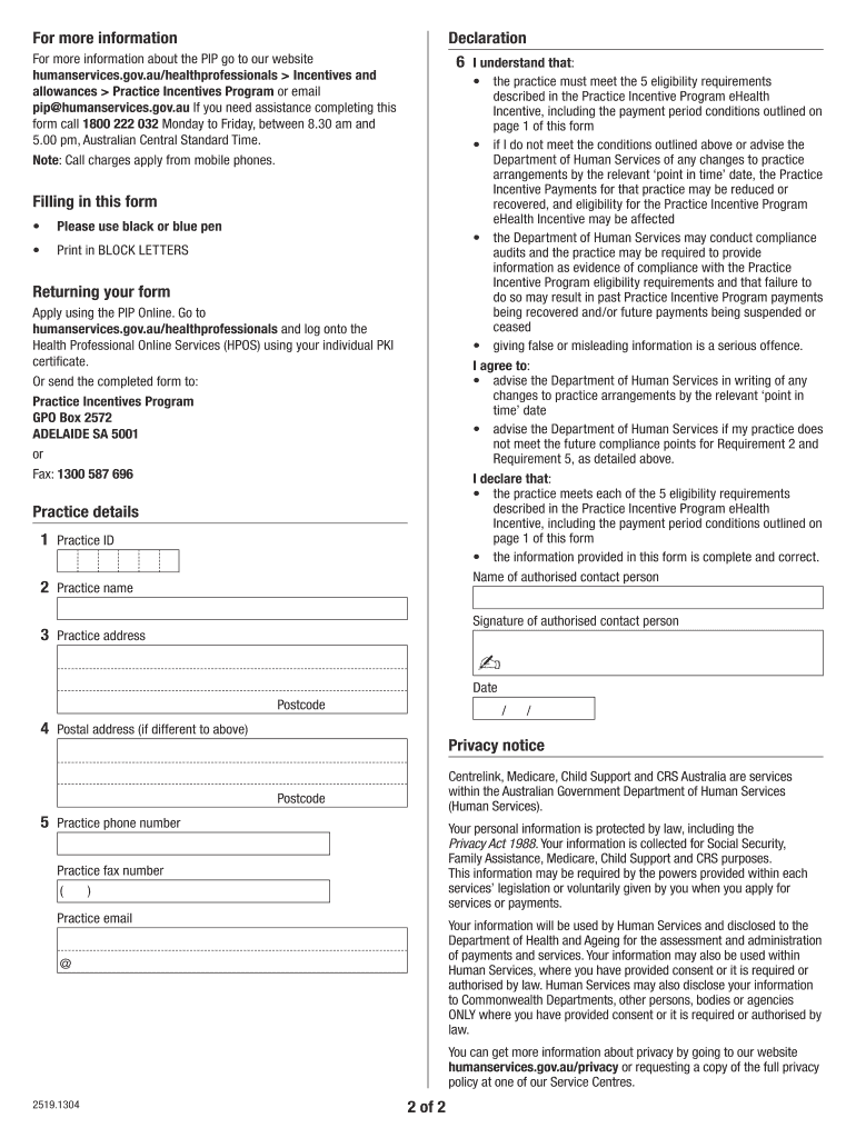 The eHealth Incentive Application Form is an application document used by Australian healthcare practices to apply for the Practice Incentives Program (PIP).
