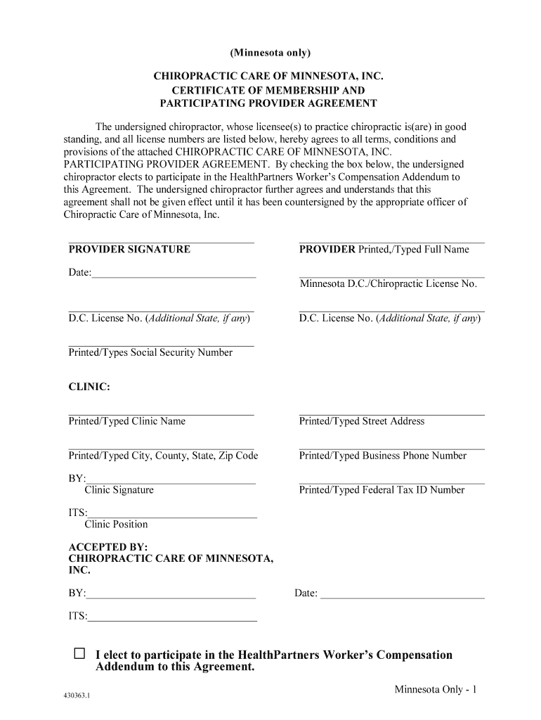 (Minnesota only) CHIROPRACTICCAREOFMINNESOTA, INC. CERTIFICATEOFMEMBERSHIPAND PARTICIPATINGPROVIDERAGREEMENT Theundersignedchiropractor, whose licensee(s)topracticechiropracticis(are)in good standing,