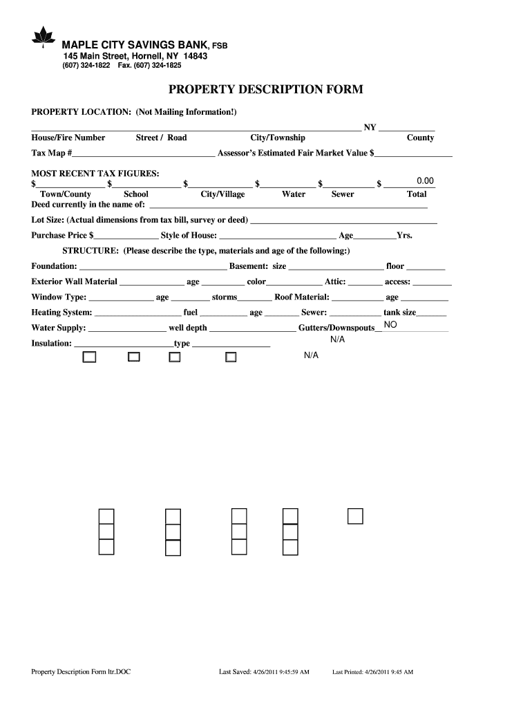 MAPLE CITY SAVINGS BANK, FSB 145 Main Street, Cornell, NY 14843 (607) 3241822 Fax. (607) 3241825 PROPERTY DESCRIPTION FORM PROPERTY LOCATION: (Not Mailing Information!) NY House/Fire Number Street