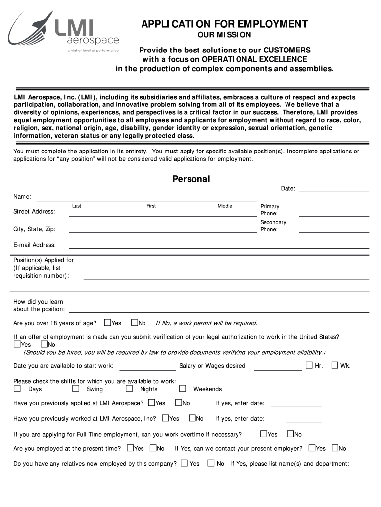 APPLICATION FOR EMPLOYMENT OUR MISSION Provide the best solutions to our CUSTOMERS with a focus on OPERATIONAL EXCELLENCE in the production of complex components and assemblies. LMA Aerospace, Inc.