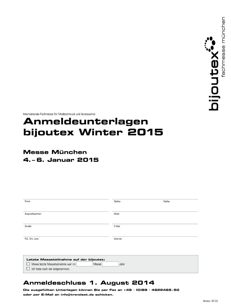 Internationale Faceless for Mode schmuck UND Accessories Anmeldeunterlagen bijoux Winter 2015 Jesse Inches 4. 6. January 2015 Firm Telephone Ansprechpartner Mobil Straw Email PLY, ORT, Land Internet